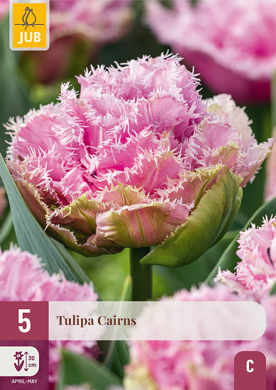 Plnokvetý strapkatý ružový tulipán. Cairns je v záhrade pútačom. Nápadný záhradný tulipán, ale vhodný aj do kvetináča na terasu alebo balkón. Pekné v kombinácii s inými strapkatými tulipánmi.