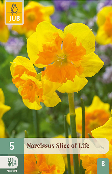 Žltý narcis s veľkou delenou oranžovou korunkou. Slice of Life si zaslúži pekné miesto vo vašom záhone alebo v kvetináči na terase či balkóne.