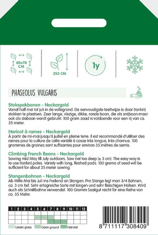 Neckargold vysievajte od polovice mája do júla na konečné stanovisko. Najjednoduchší spôsob pestovania je s oporou tyčiniek. Veľmi dlhá, mäsitá, hustá, okrúhla fazuľa, ktorá sa používa ako fazuľka ale aj ako struková fazuľa keď sú struky maldé.