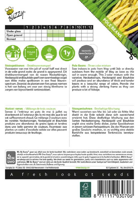 Trojfarebná zmes Vysievajte od mája vo vnútri do júla alebo od polovice mája priamo do voľnej pôdy, hneď ako sa pôda zohreje. Táto trojfarebná zmes odrôd Neckarkönigin, Neckargold a Blauhilde produkuje bohatú úrodu hustých, jemných strukov v nádhernom farebnom spektre. Pretože rastliny tvoria veľkú úrodu, je dôležité zabezpečiť pevnú oporu, napríklad z bambusových tyčiek.