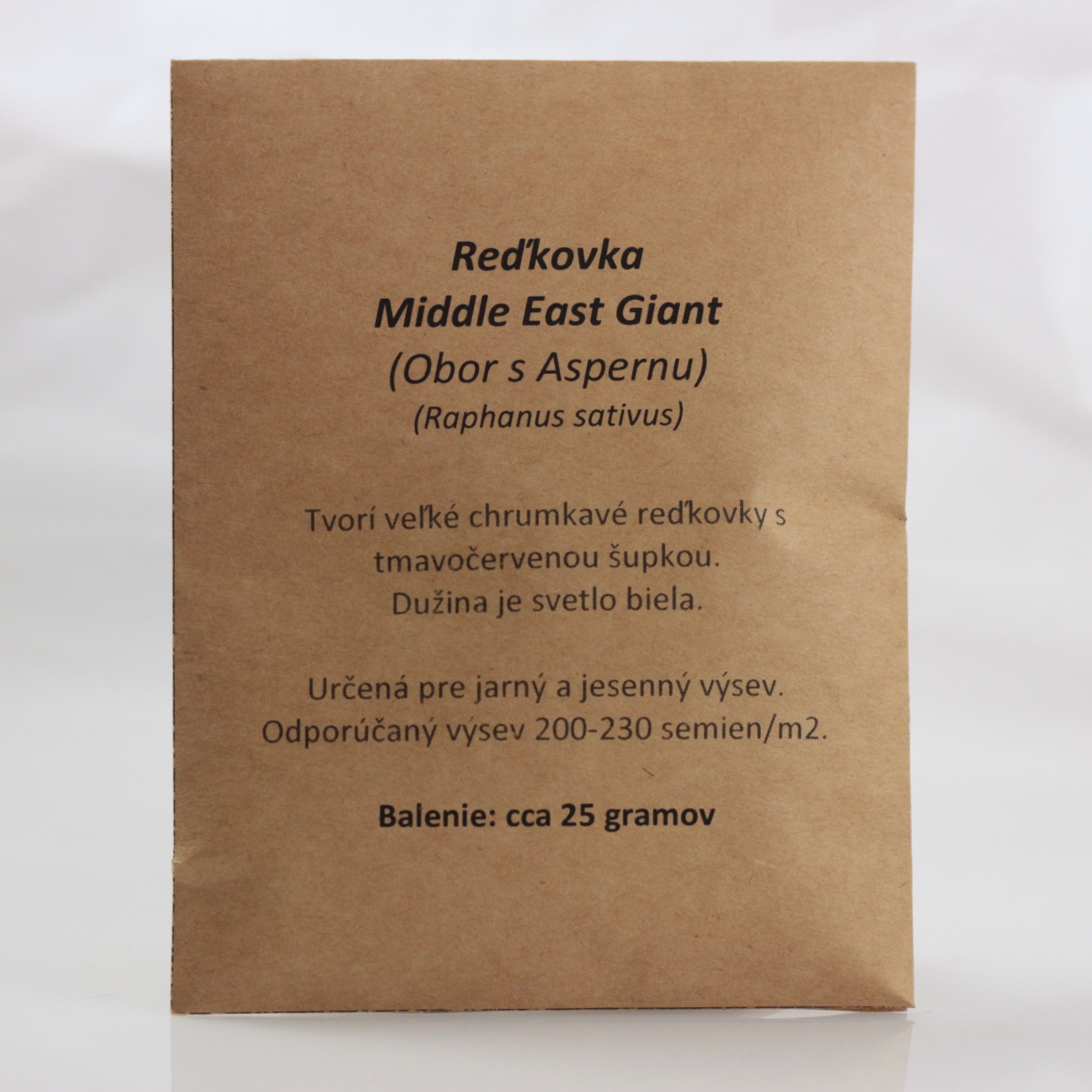 Reďkovka Middle East Giant 25 g 5,10 € Kód tovaru: X101 Pridať do obľúbených Späť na: Reďkovka, reďkev Popis Middle East Giant Tvorí veľké reďkvičky, chrumkavej štruktúry s tmavočervenou šupkou. Dužina je svetlobiela. Určená pre jarný a jesenný výsev. Odporúčaný výsev 200-230 semien/m2 .