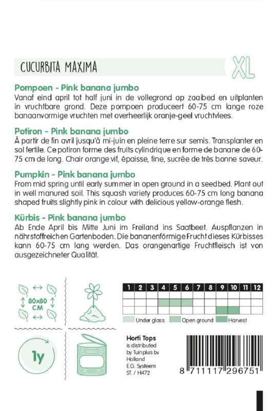 Výsev od konca apríla do polovice júna na otvorenom priestranstve na záhon a vysádzajte do úrodnej pôdy. Táto zimná tekvica produkuje 60-75 cm dlhé ružové plody banánového tvaru s lahodnou oranžovo-žltou dužinou.