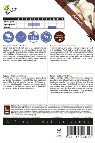 Butternut tekvica so sladkou pomarančovou dužinou. Bohatá chuť tekvice na pečenie alebo maškrtenie. Vynikajúce, keď sa nakrája na kocky a pridá sa do duseného mäsa s teplými koreninami, ako sú klinčeky, kardamón, kari, rasca, kajenské korenie a paprika.